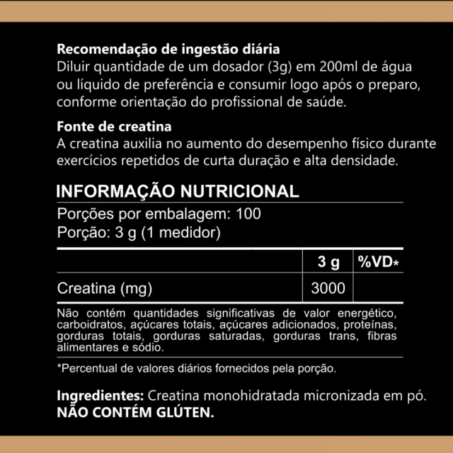 Creatina monohidratada micronizada em pó. NÃO CONTÉM GLÚTEN.